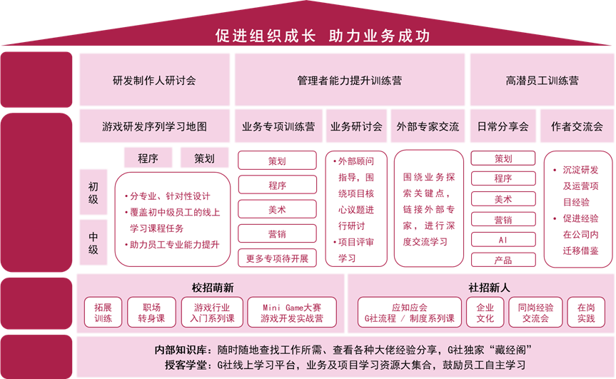 公司为全体员工提供多种类别的专业能力提升培训,支持员工根据自己的岗位职责、专业需求、兴趣偏好等选择适合的培训课程和学习资源。培训内容覆盖通用技能和专业课程,一方面帮助员工掌握基础技能,提升团队整体业务水平;另一方面聚焦产品技术、策划、美术及发行支撑等相关课程,确保员工能力建设与业务需求紧密对齐,助力团队高效协同合作,保障产品成功上线。